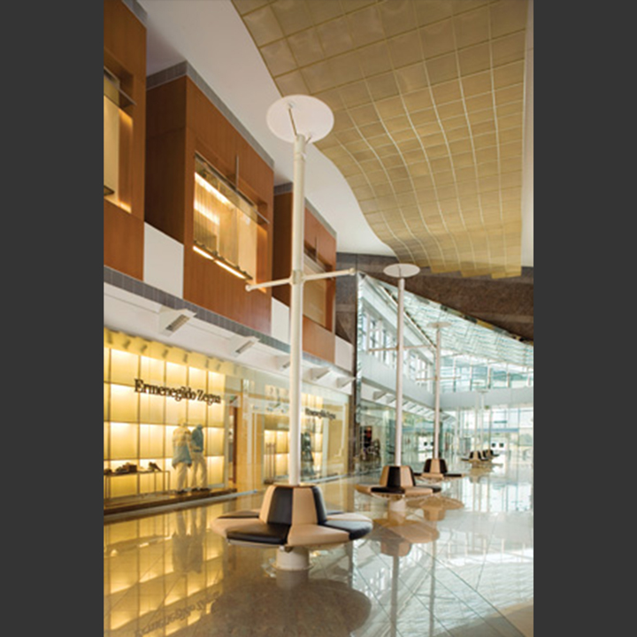Clad in silver aluminum panels and silver and copper reflective glass, the uniquely contemporary forms of these towers has become a symbol of modern Dubai. Flanking each tower at its base are low curvilinear structures, reminiscent of massive shifting sand dunes, housing parking and service elements.
